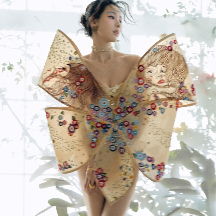 拍摄当日的造型呈现堪称视觉盛宴,成为整场事件的核心高潮。封面造型选用黎巴嫩设计师品牌Geyanna Youness定制系列,低饱和柔色裙身如春日薄雾,立体刺绣将蝶翼与花卉藤蔓交织缠绕,行走间裙摆翻飞,宛如振翅欲飞的蝴蝶,灵动又浪漫。内页更解锁重磅惊喜,陈都灵首穿亚洲艺人罕见的Rahul Mishra 2025秋冬高定,印度手工刺绣的浓烈色彩与欧式廓形碰撞,蝶翼状立体设计自带梦幻滤镜。两种风格迥异的造型,在她清冷书卷气的调和下完美融合,形成“东方含蓄碰撞西方浓烈”的独特美学语言,搭配MIKIMOTO高级珠宝的珍珠光泽,冷调妆容与春日元素相得益彰,被网友盛赞为“行走的春日画卷”。